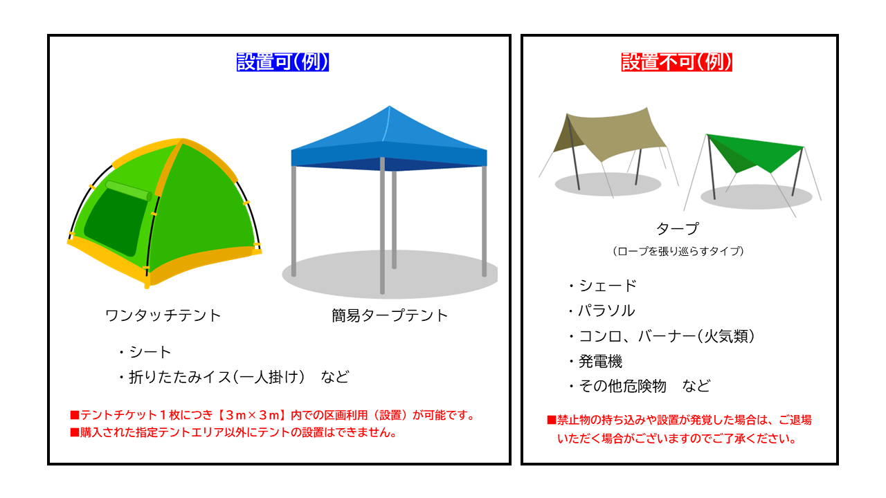 - テントチケットを事前購入されていない方は会場内にテントの設置ができませんのでご注意ください。